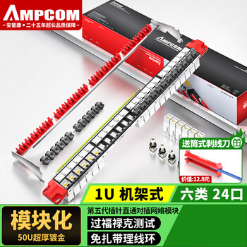 安普康(AMPCOM)六类24口免打配线架 CAT6非屏蔽模块化旋转免打网络配线架 工程级1U机架式 红色 AMC63024RD