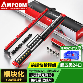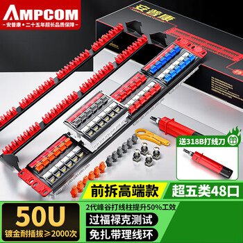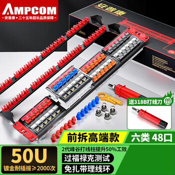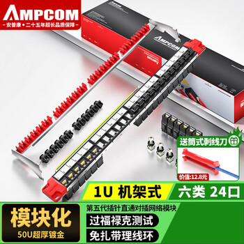 安普康(AMPCOM)六类24口免打配线架 CAT6非屏蔽模块化旋转免打网络配线架 工程级1U机架式 红色 AMC63024RD