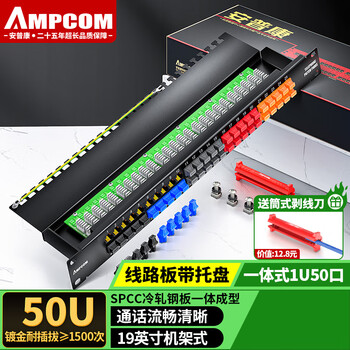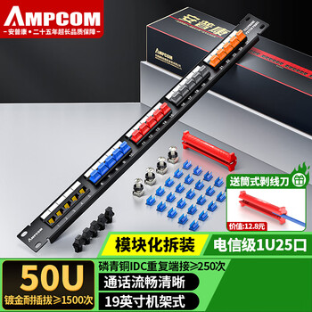 安普康(AMPCOM)电话配线架50口 1U机架式RJ11语音配线架 50对大对数工程级50U镀金电话线水晶头跳线架AMDH50