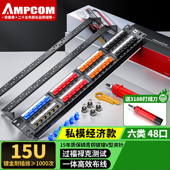 安普康(AMPCOM)六类24口网络配线架 模块RJ45千兆CAT6类非屏蔽网线跳线架 1U机架模块化过福禄克链路AMC62024BU